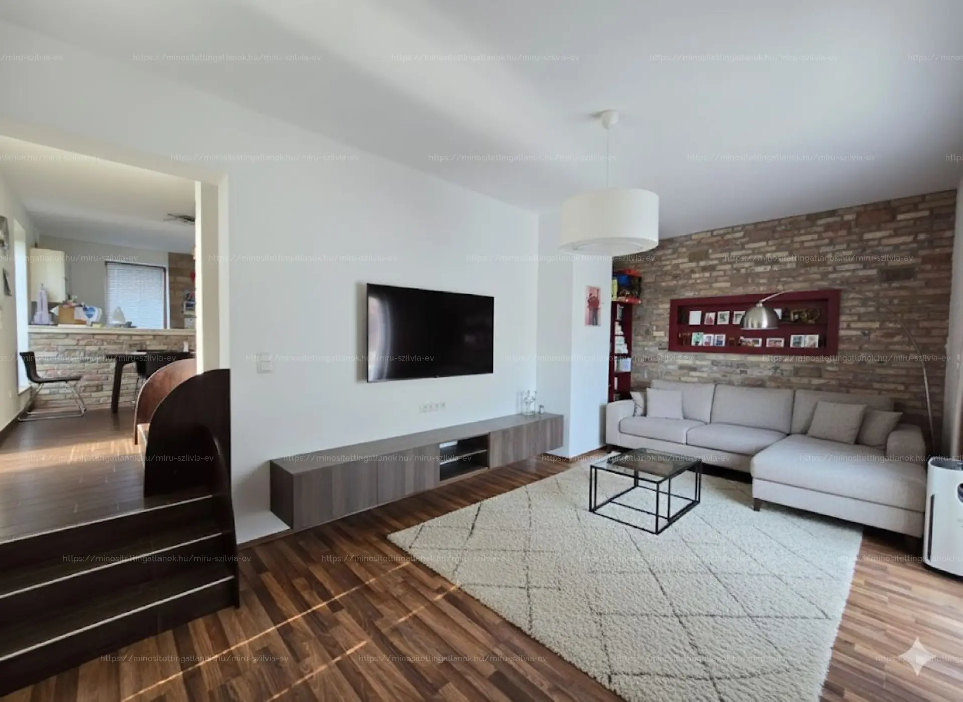 Eladó Diósdliget egyik csendes, romantikus kis utcájában egy belső háromszintes 192 nm-es (150 nm lakótér + 45 nm garázs + 38 nm terasz) rendkívül otthonos családi ház 442 nm-es gondozott kerttel.
