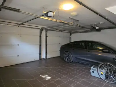 Parkolni a házkapcsolatos dupla garázsban lehet, de van további autónak térkövezett beálló is.