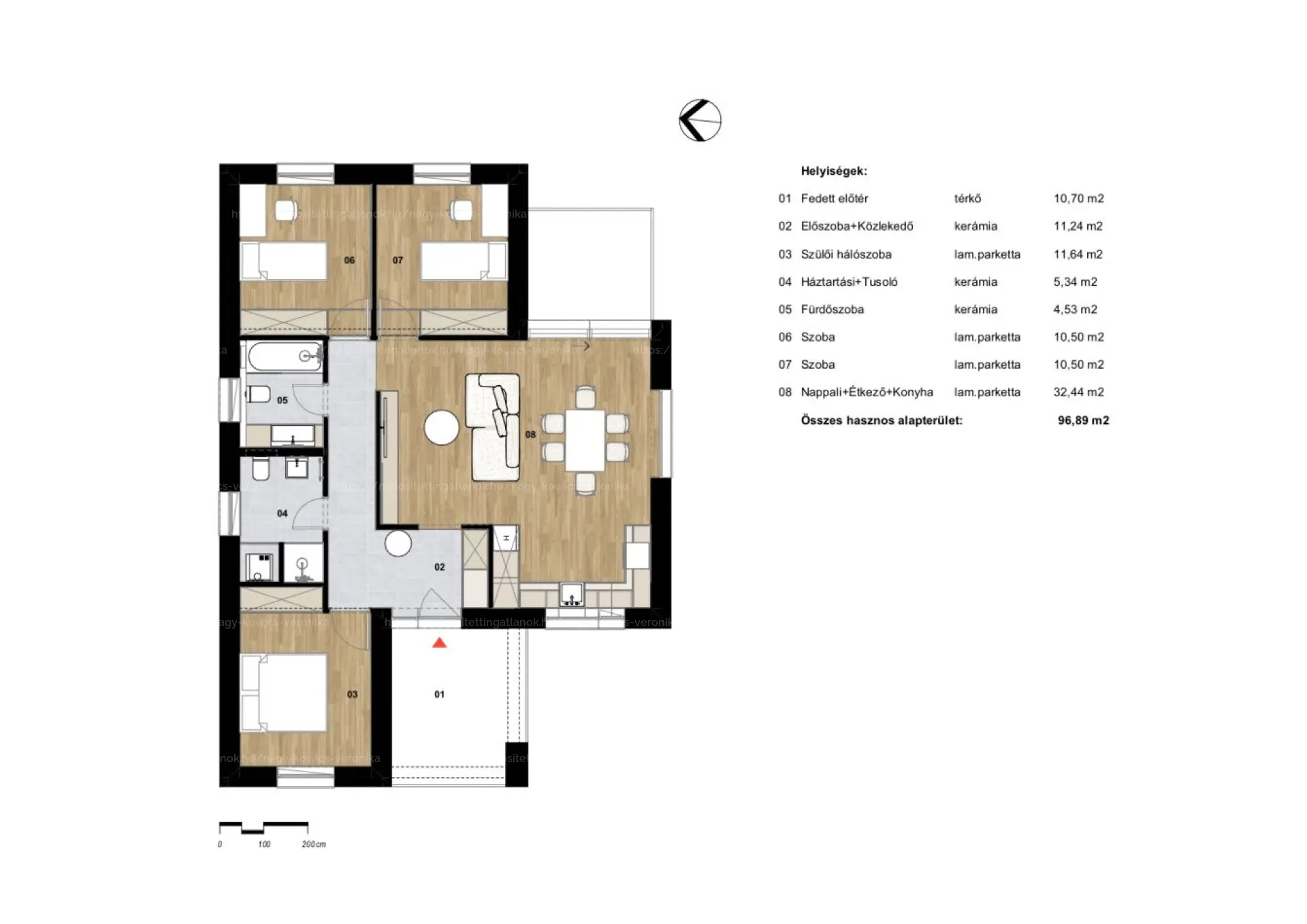 A 431 m²-es belterületi telken elhelyezkedő ingatlan nettó alapterülete 96,89 m², plusz egy 11 m²-es terasz, valamint egy különálló, 6 m²-es kerti tároló is kiegészít.