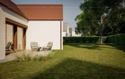 A ház építése most indul, így még minden vadonatúj lesz, amikor beköltözöl – a látványtervek pedig segítenek elképzelni, milyen lesz itt élni. A természetes fényben úszó nappali, a teraszra nyíló tolóajtó vagy a kert nyugalma már most is érezhető a részletekben.