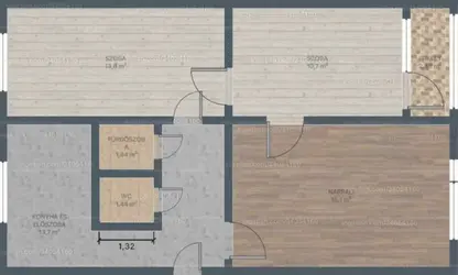Egy egész és két fél szoba, előszoba-folyosó, konyha, kamra, fürdőszoba és külön WC alkotja. A belső tereket jól kihasználható fedett erkély egészíti ki.