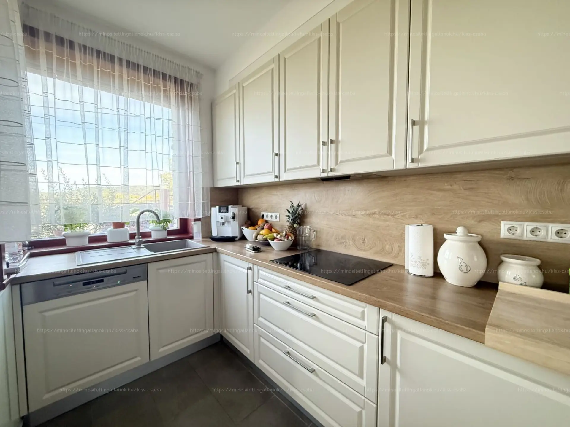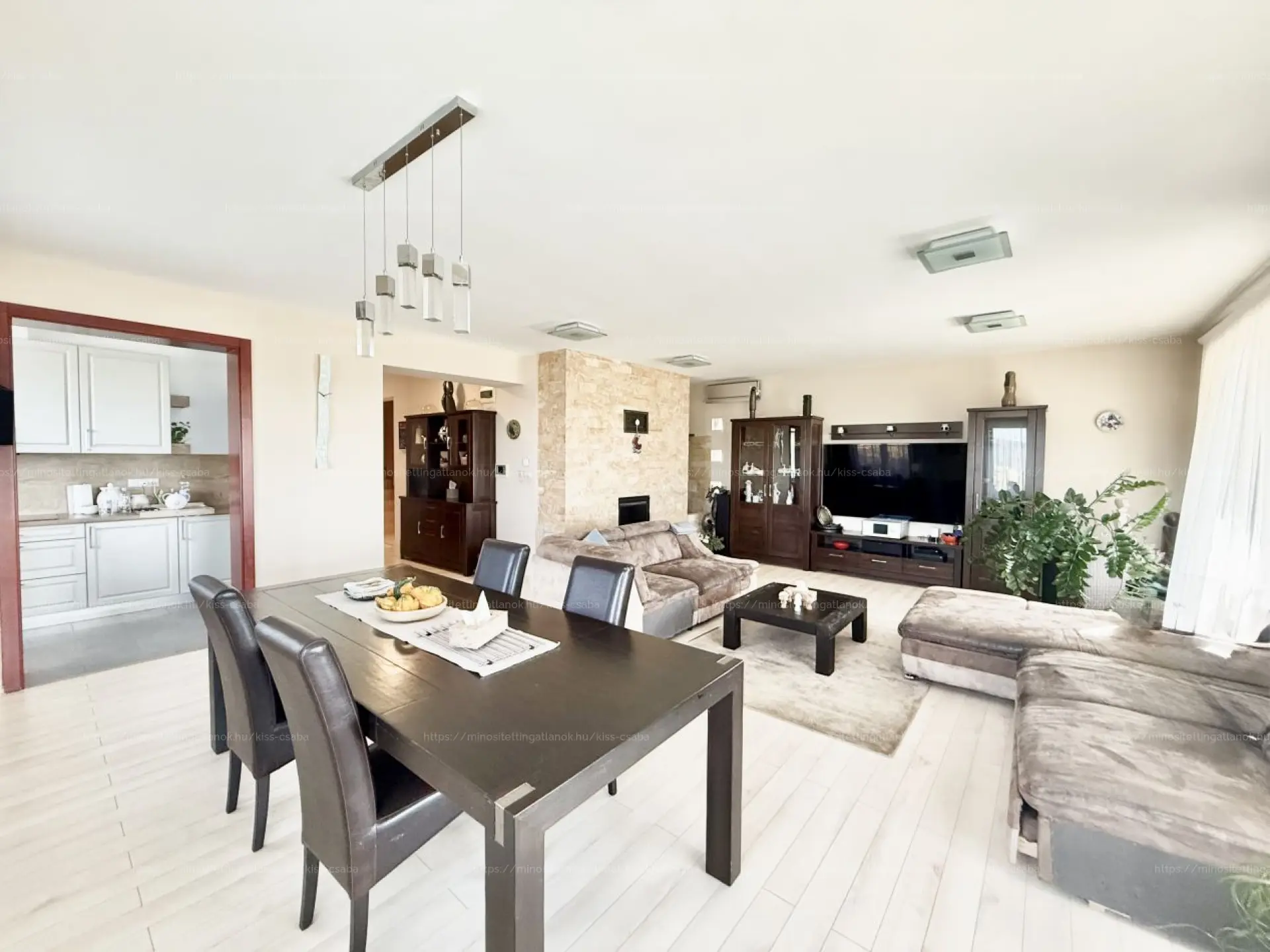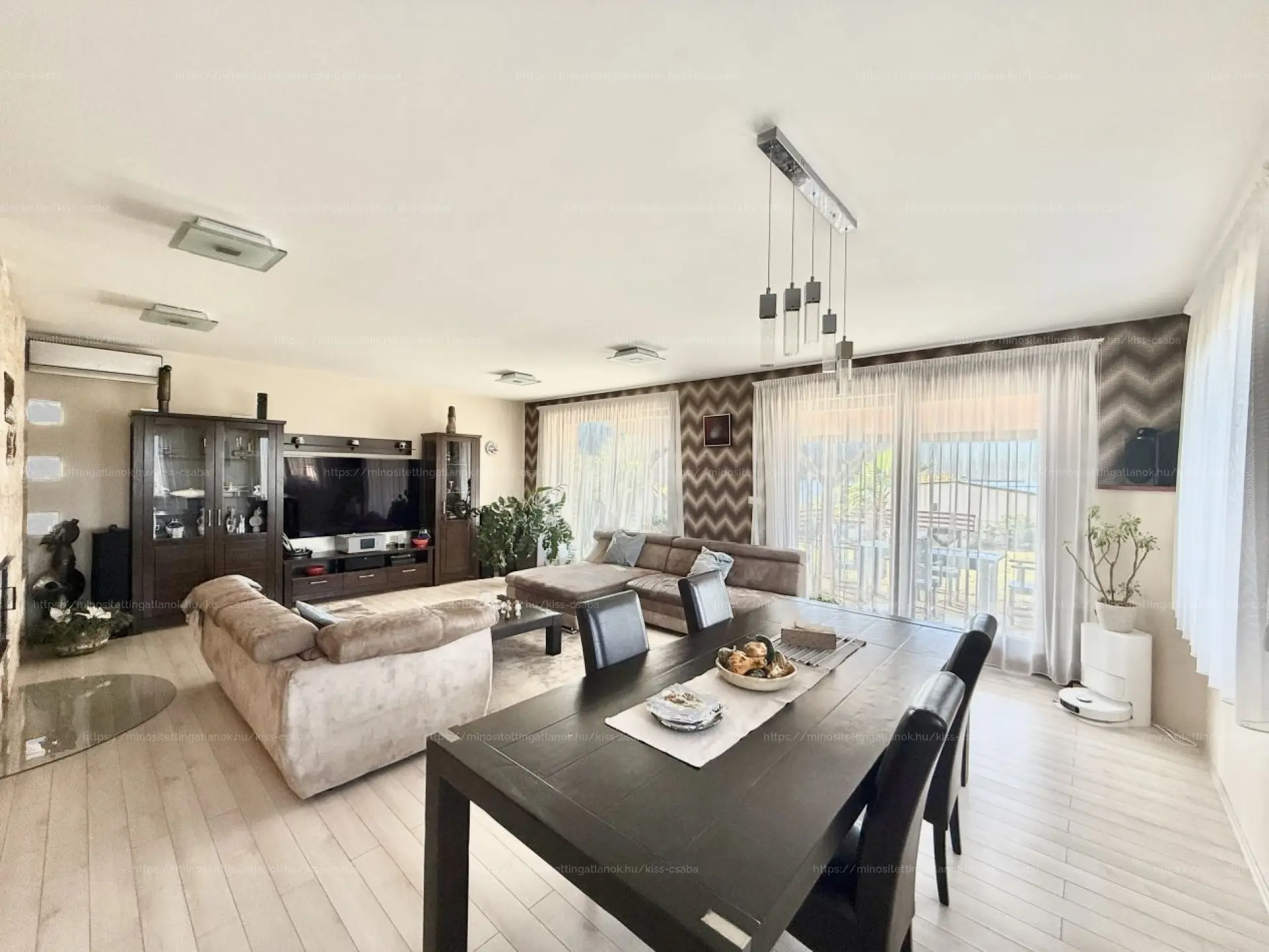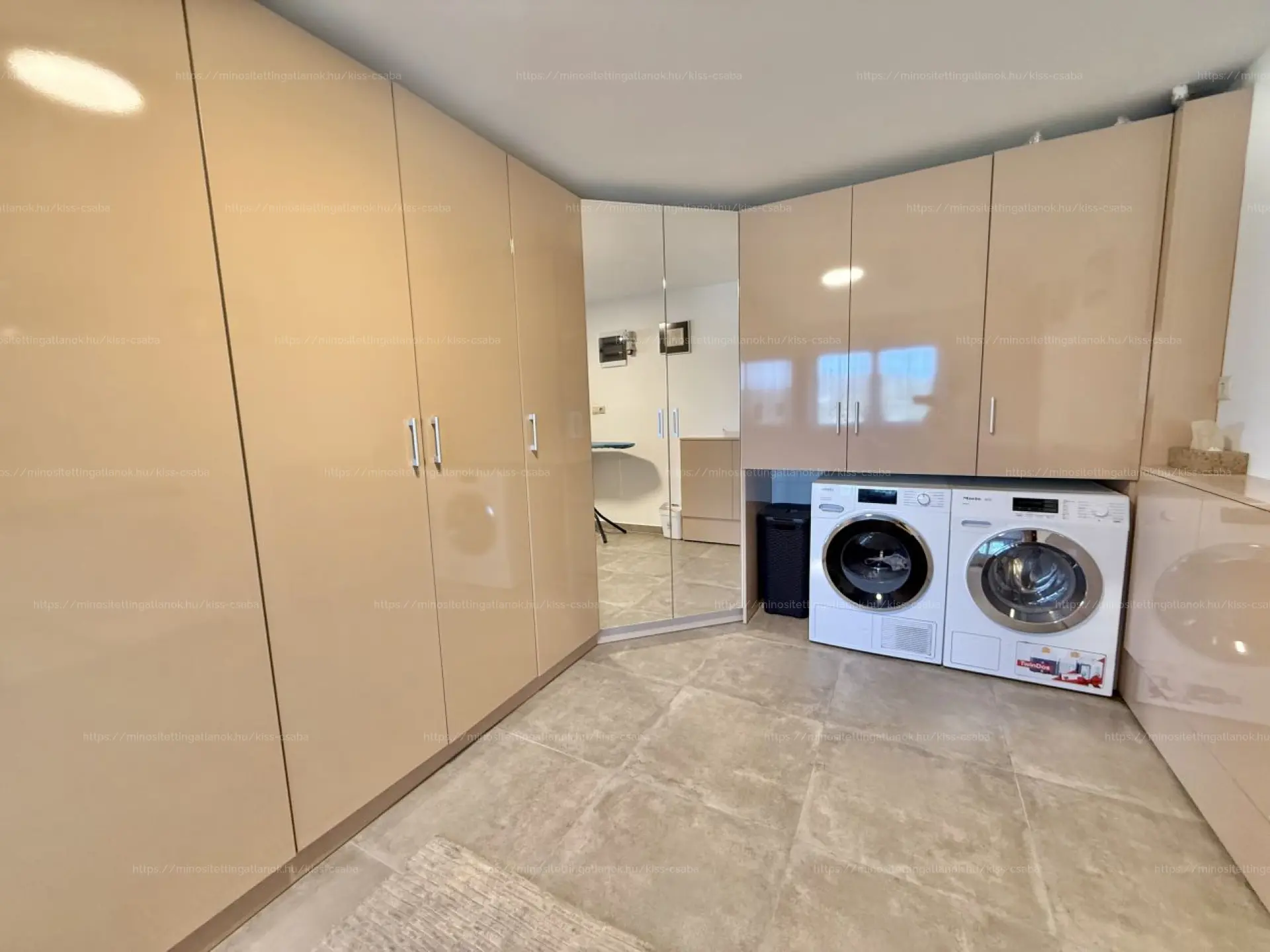A belső terek átgondolt elrendezésűek: tágas nappali, kényelmes étkező, vadonatúj, modern konyha, két gyermekszoba, egy hálószoba, két gardrób, két fürdőszoba és két különálló mosdó biztosítja a család kényelmét. A házhoz két nagyméretű terasz, egy óriási pince, valamint gondozott, mediterrán hangulatú kert tartozik automata öntözőrendszerrel és játszótérrel.
