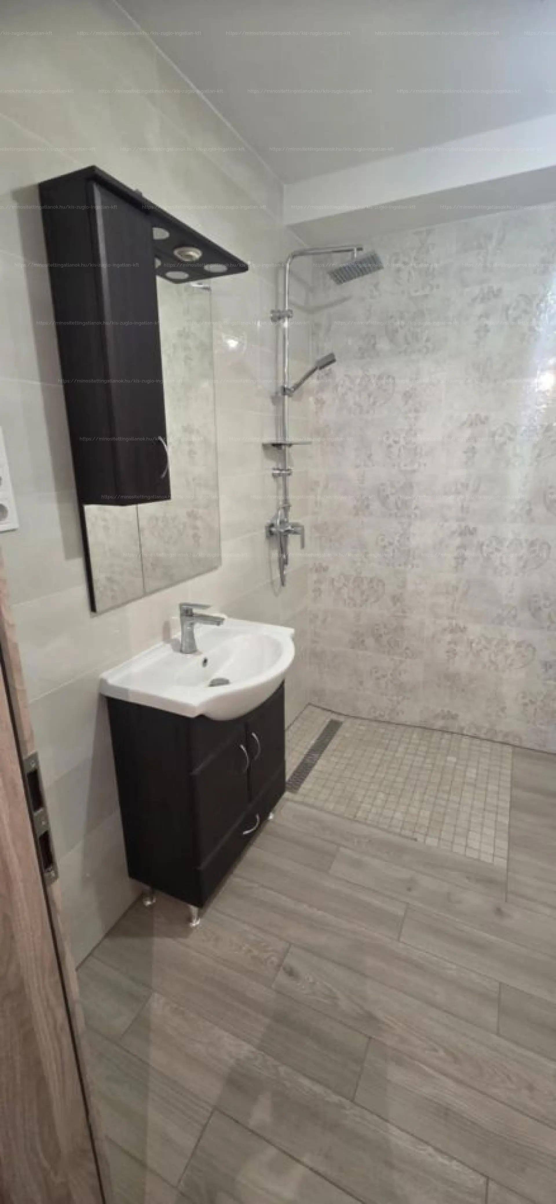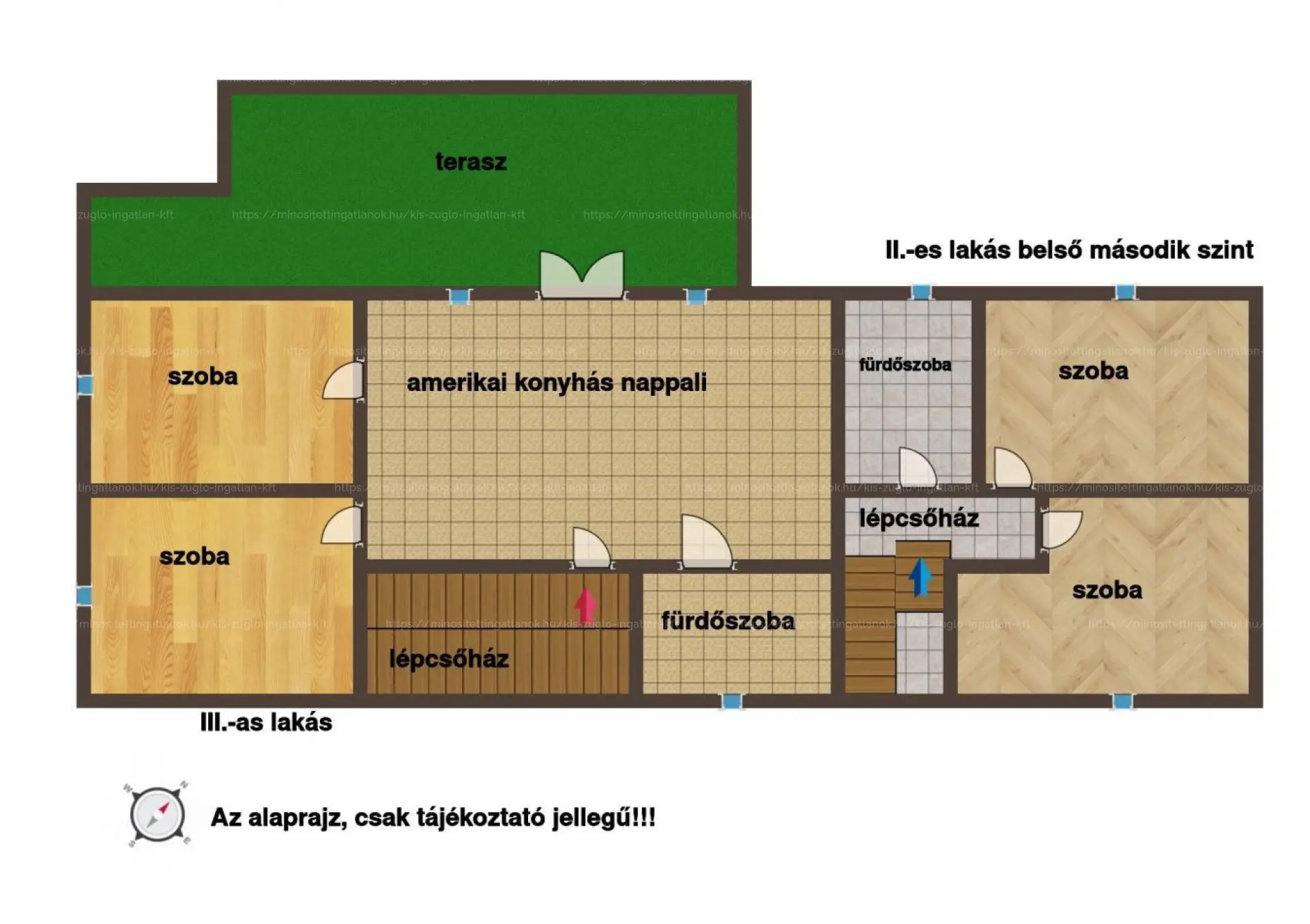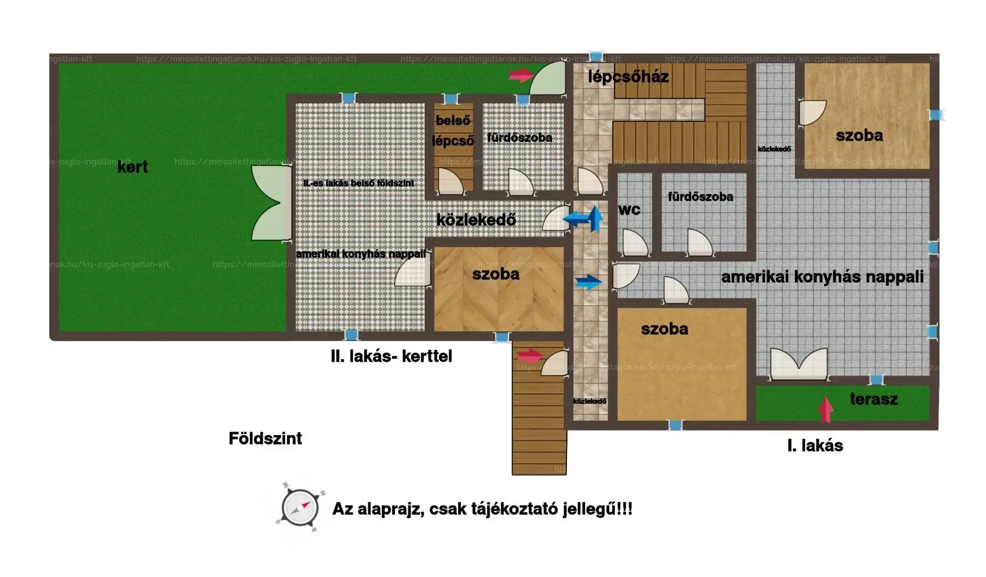 Elosztását tekintve: előszoba, wc, közlekedő, fürdő, 2 szoba, amerikai konyhás nappali, terasz