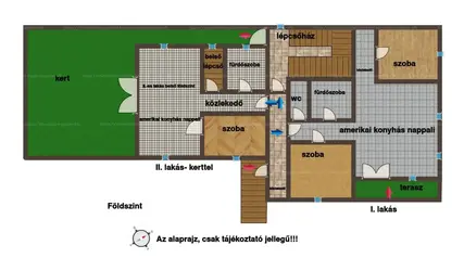 Elosztását tekintve: előszoba, közlekedő, 2 fürdő, lépcső, amerikai konyhás nappali. 3 szoba,