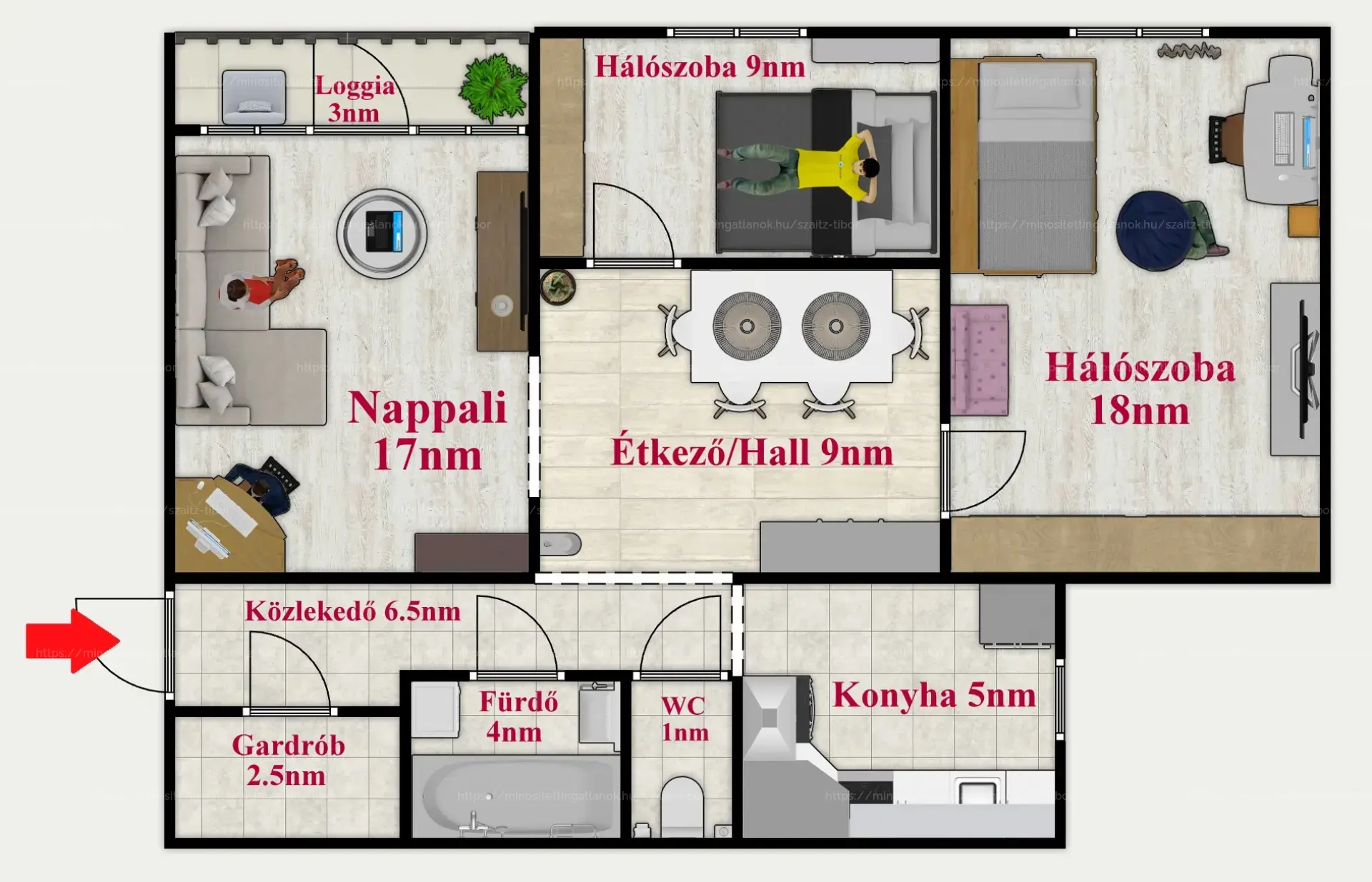 + Nappali + 2 hálószoba vár itt rád, ahol még egy étkező is ki lett alakítva a hallban.