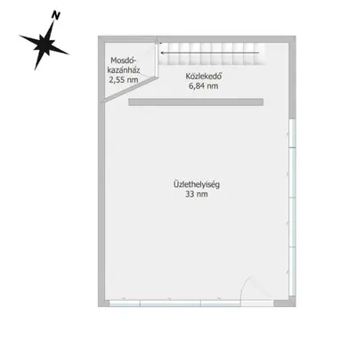 - itt található az üzlethelyiség, közlekedővel, 2,55 nm-es mosdó-wc-kazánházzal, és az emeletre vezető lépcsővel.