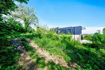 A telek széles, az eleje enyhe lejtéssel, kitisztítva építkezéshez.