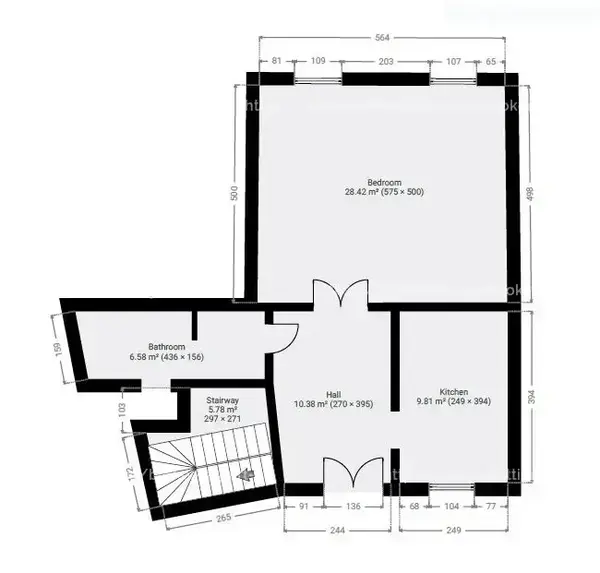 •Földszint: nagy nappali (28,5 m²), konyha, fürdőszoba + wc, közlekedő, lépcsőtér.