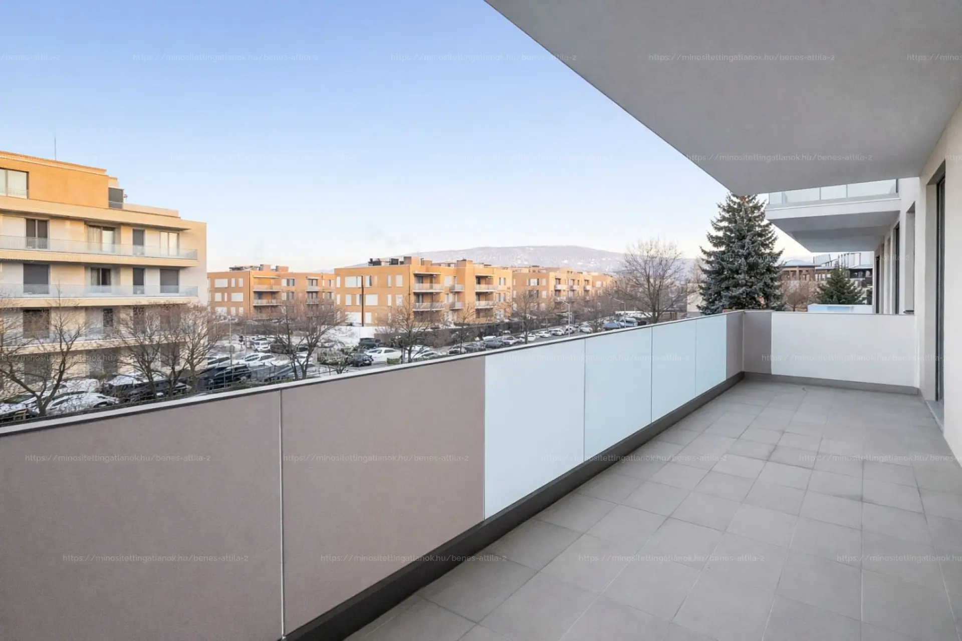 A lakás a 2. emeleten helyezkedik el, liftes épületben. Délnyugati tájolásának és nagy üvegfelületeinek köszönhetően egész nap világos, a nappaliból és mindkét hálószobából szabad panoráma nyílik a Budaörsi-hegyek irányába. A 17 m²-es erkély valódi élettér: alkalmas étkezésre, pihenésre, növények elhelyezésére is.
