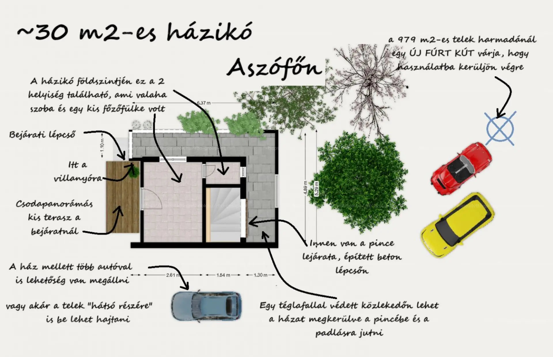 Das Gebäude hat eine Außenfläche von ca. 25–30 m², die sich über drei Ebenen nach einer umfassenden Renovierung nutzbar gestalten lassen könnte. Derzeit ist der Dachboden noch ungenutzt. Bisher wurde das Grundstück als Hobbygarten genutzt, und im Haus wurden ein Zimmer sowie eine kleine Kochnische eingerichtet. Der Keller wurde früher zur Weinlagerung verwendet, was der historische Edelpilzbelag noch heute verrät.
