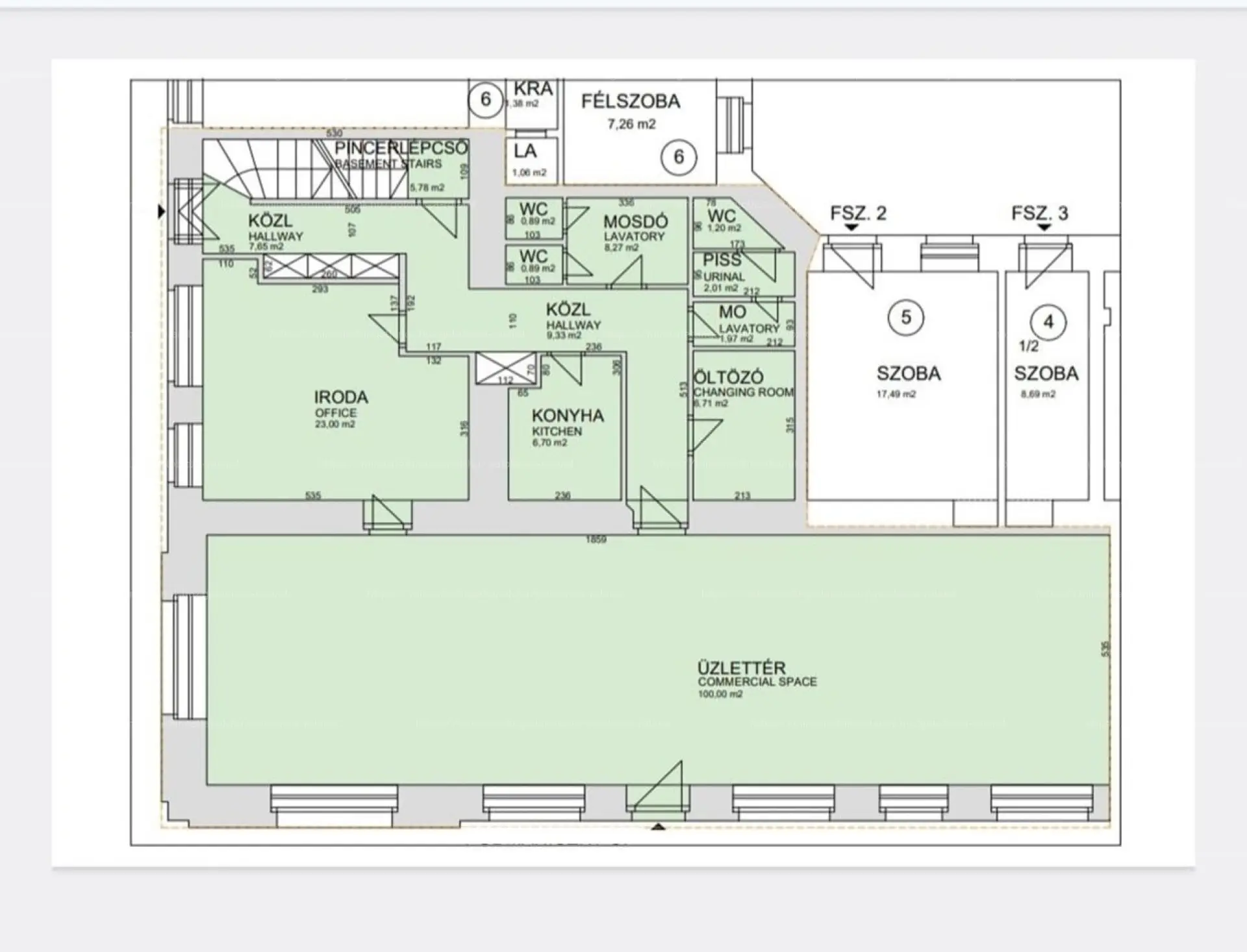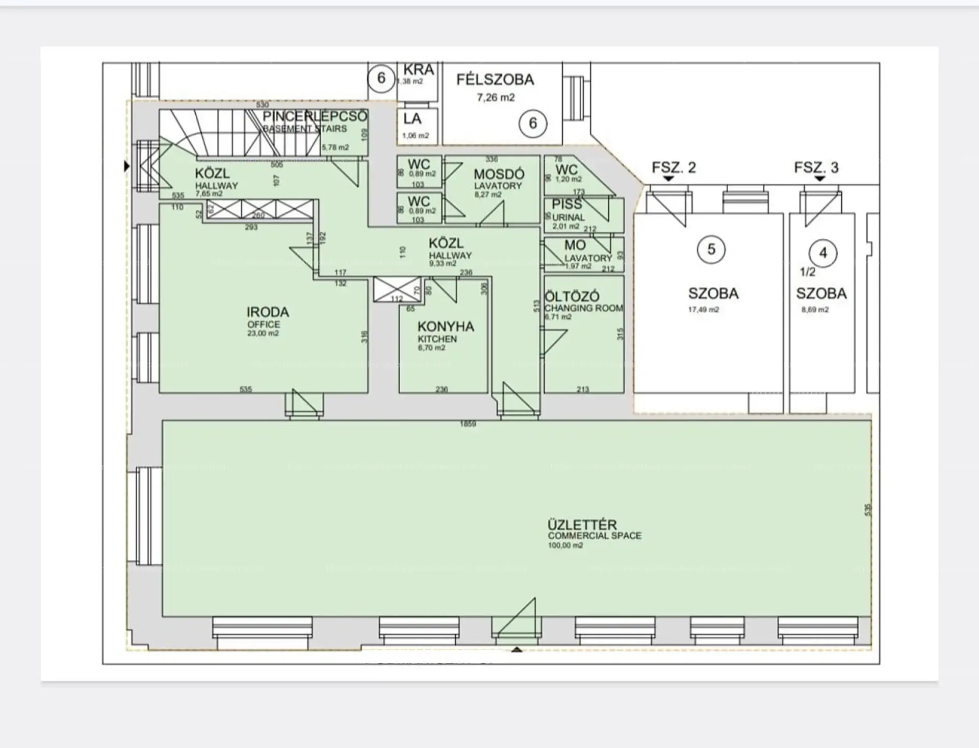 • Alagsor – 115 m²: irattár/raktárblokk, utcai árucsúszdával