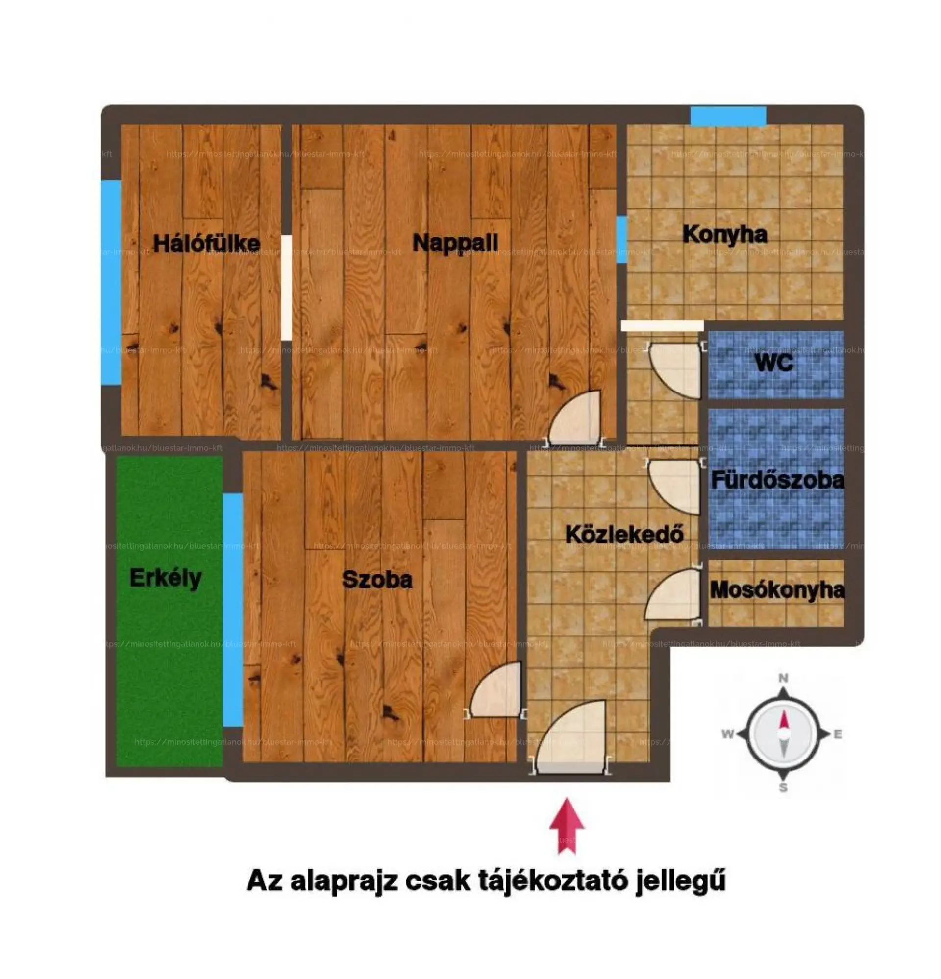Elosztás: 2 külön nyíló szoba + gardrób + konyha + fürdő + külön WC + mosókonyha