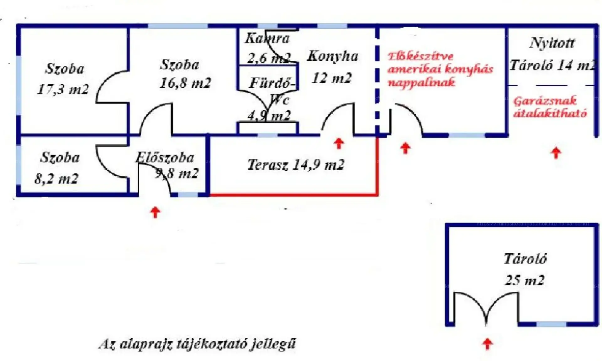 RUGALMAS TEREK, VALÓDI BŐVÍTÉSI LEHETŐSÉG: a leírás szerint +20 nm bővíthető terület áll rendelkezésre, továbbá a főépülethez kapcsolódó, közel 30 nm-es tároló hozzányitásával amerikai konyhás nappali, vagy tágas konyha-étkező és egy plusz szoba alakítható ki. A munkálatok megkezdődtek, a befejezés az új tulajdonosra vár.