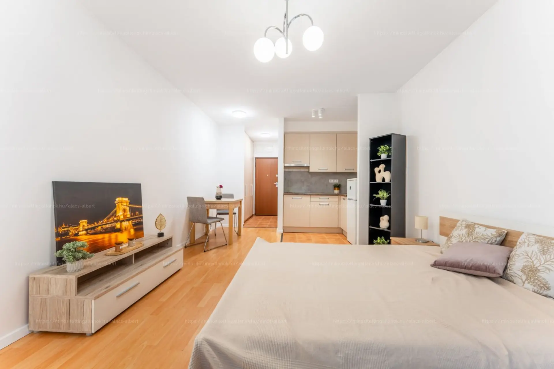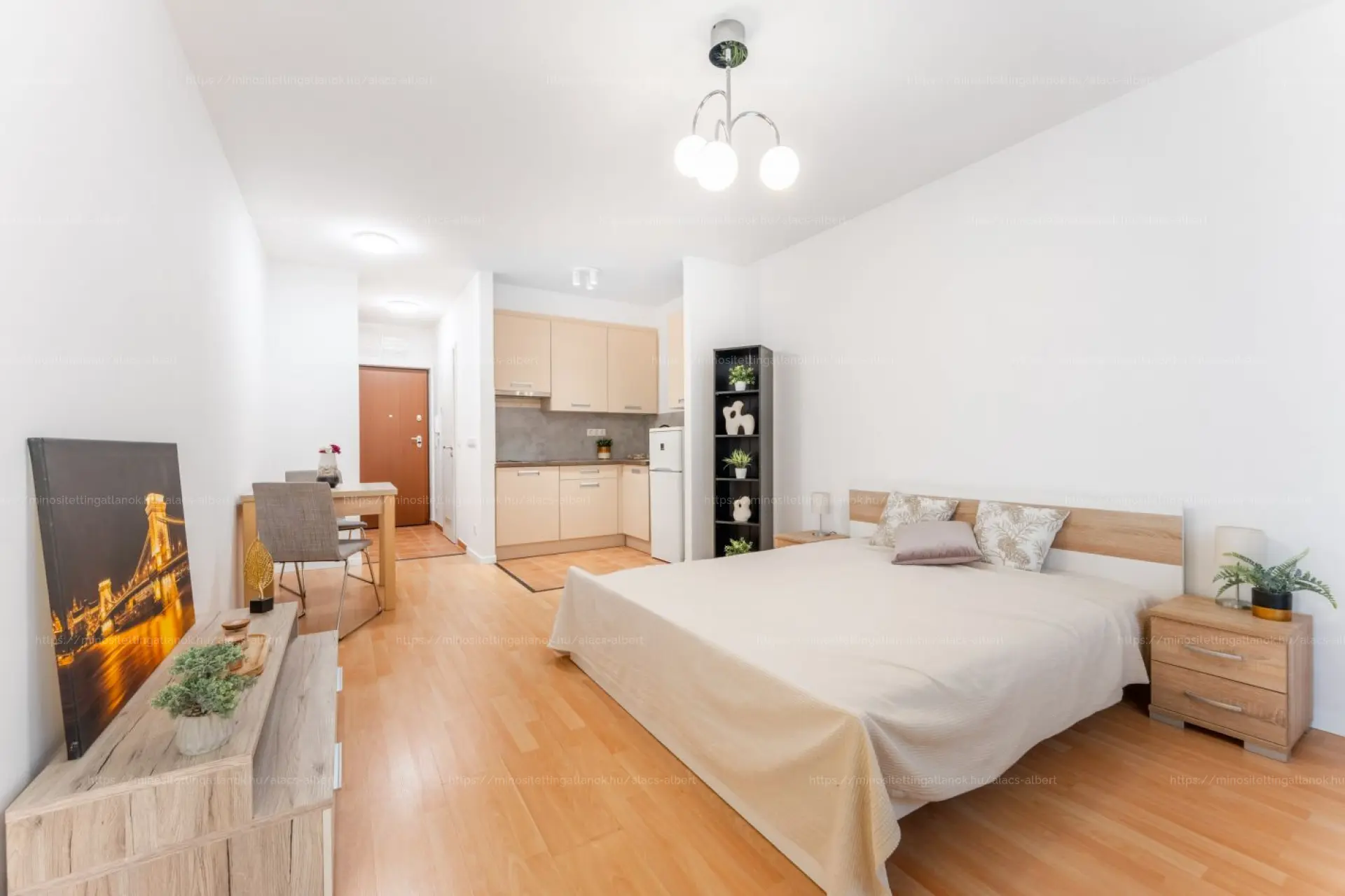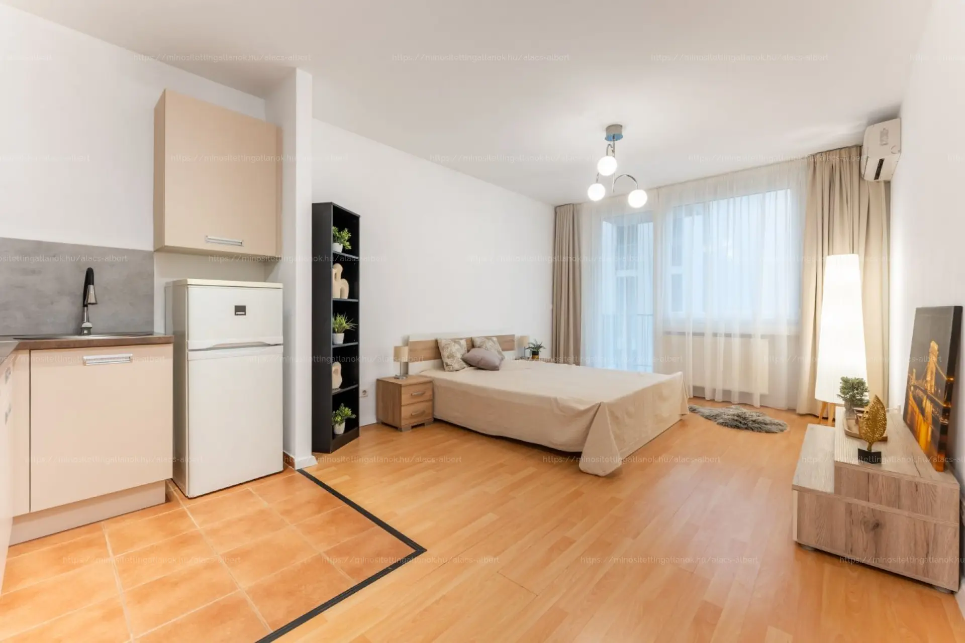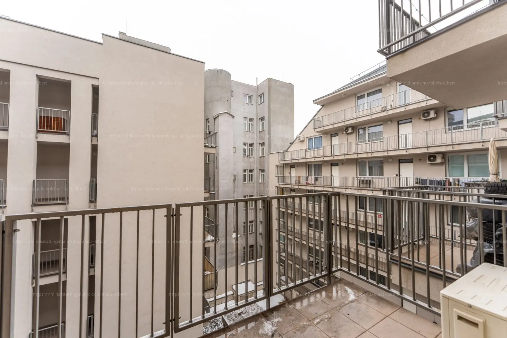 27 m²-es, 5. emeleti, erkélyes stúdiólakás modern társasházban. A lakás déli tájolású, így világos, napos, az erkély pedig valóban hozzáad a kompakt alapterülethez.