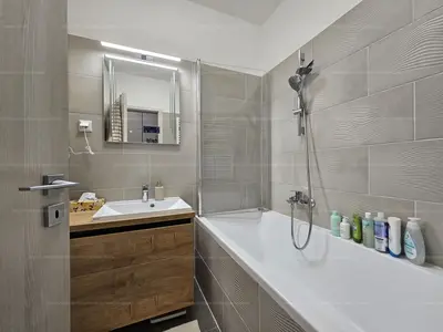 A lakás praktikus elosztású: a szobák külön nyílnak a nappali egyik és másik oldaláról, külön helyiségben található fürdőszoba és wc. Asztalossal méretre gyártott beépített szekrények az előszobában és a fürdőszobában.