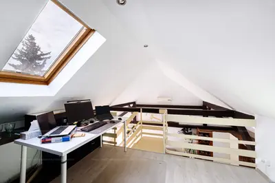 - a galériaszinten egy nyitott, világos dolgozó- vagy vendégszoba, beépített gardrób és extra tárolófelületek