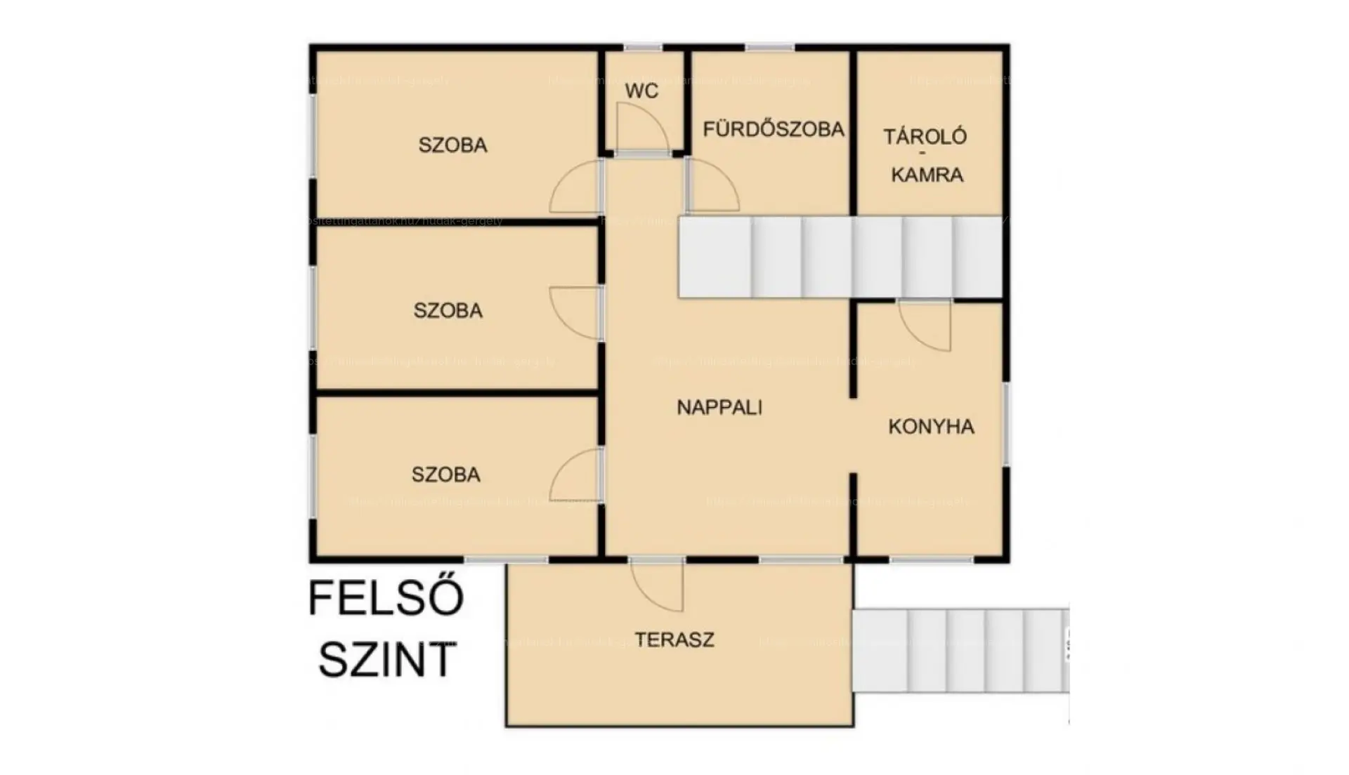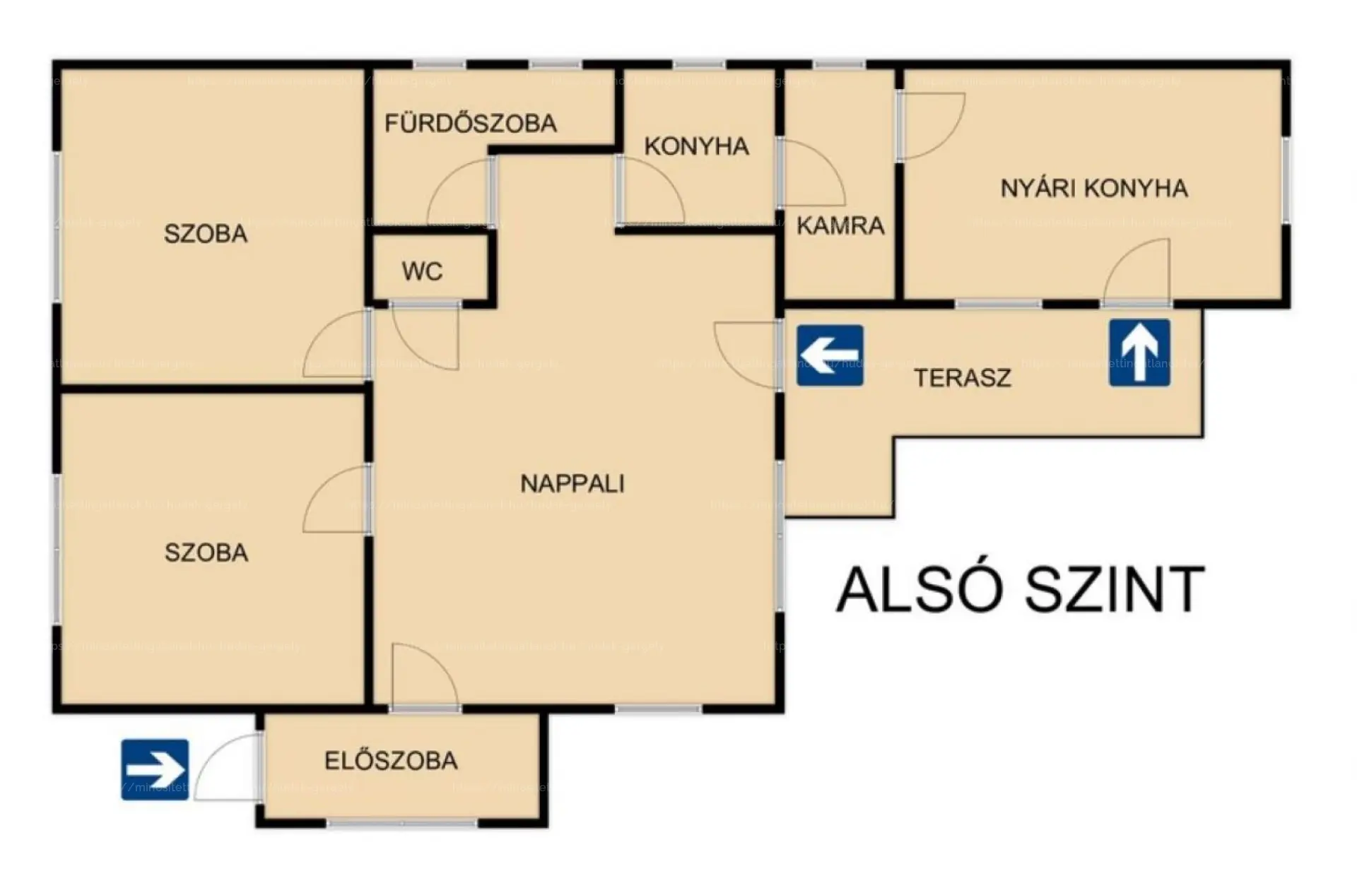 Helyiségek a földszinten: nappali, 2 hálószoba, fürdőszoba, wc, konyha, nyári konyha, kamra, előszoba. A teraszra a nappaliból és a nyári konyhából is kijuthatunk.