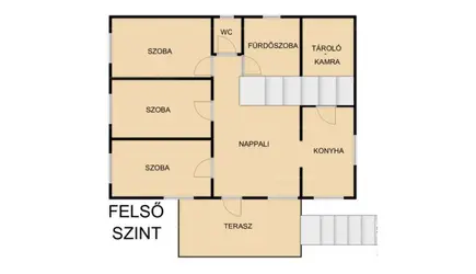 A felső szinten nappali, 3 különnyíló hálószoba, fürdőszoba, wc- mosdó, konyha, kamra helyiségek lettek kialakítva. A terasz irányából külső feljáró épült, de belülről is megközelíthető az emelet.