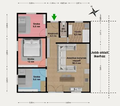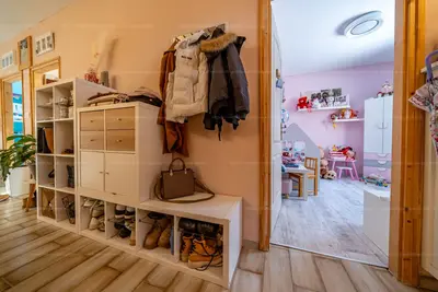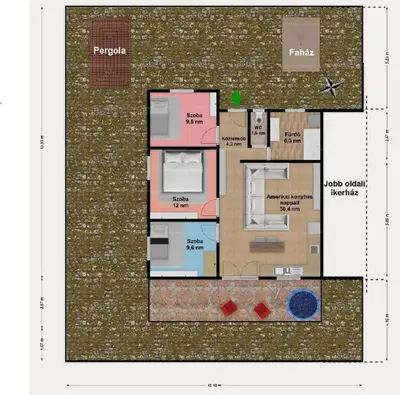 A nettó hasznos lakóterület 74 m2. A kertben egy 15 m2-es kisház/tároló és a fedett terasz, valamint egy kiülős pergolás rész is könnyíti a tárolást.