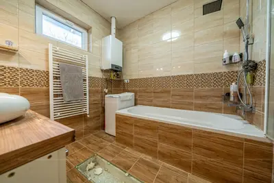A ház fűtéséről, melegvíz ellátásáról kondenzációs kazán gondoskodik lapradiátoros hőleadókon kersztül.