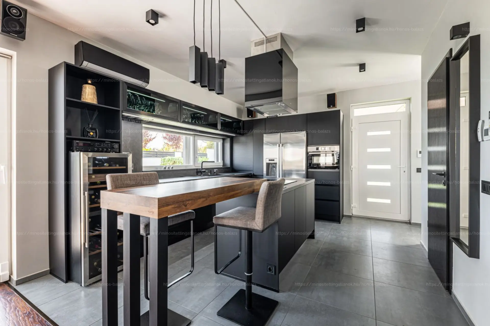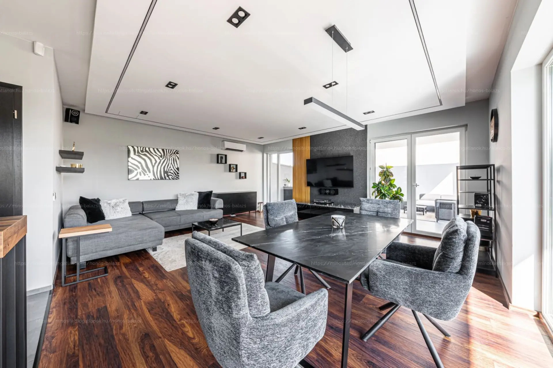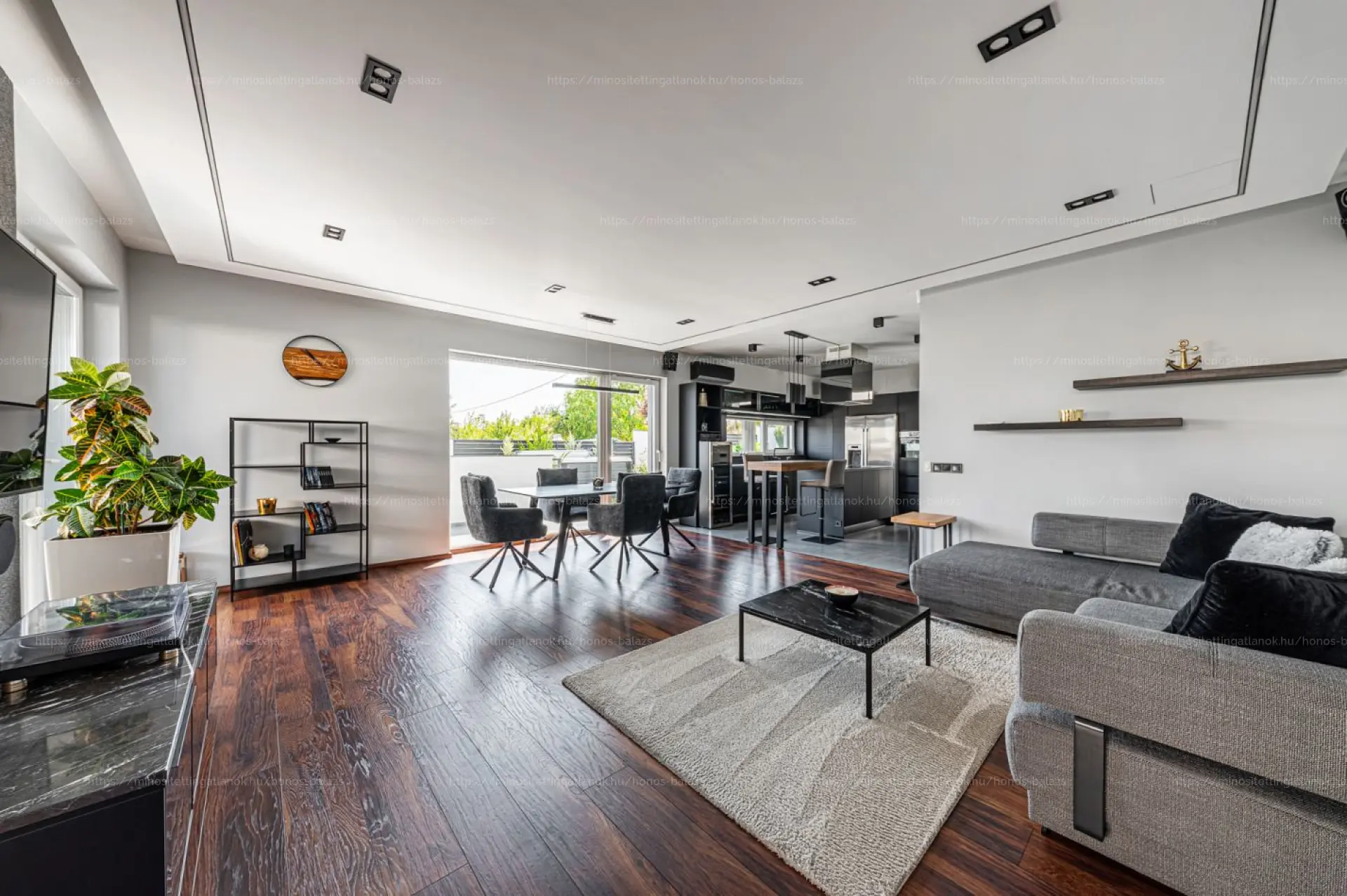 A hangulatot prémium parketta, többzónás LED-es rejtett világítás és beltéri-kültéri DENON hangrendszer teszi teljessé.