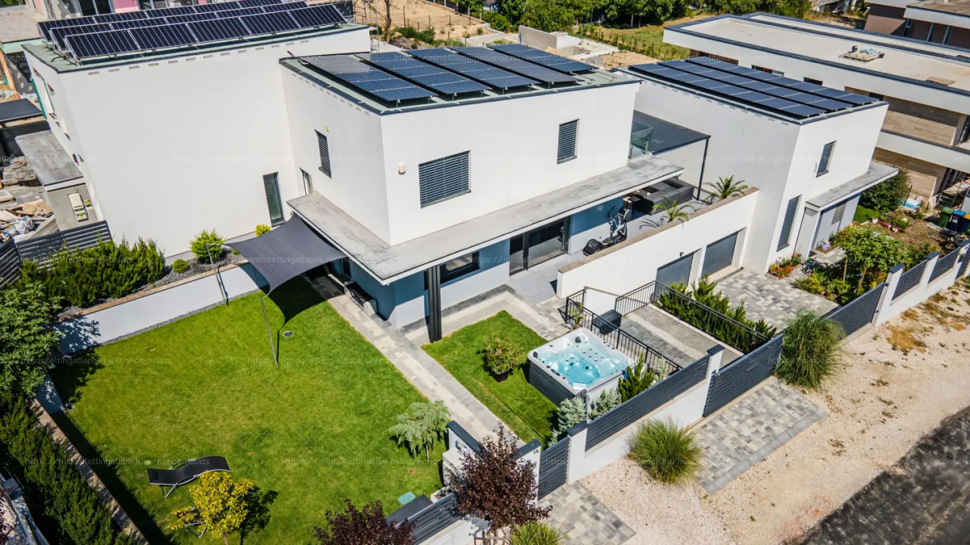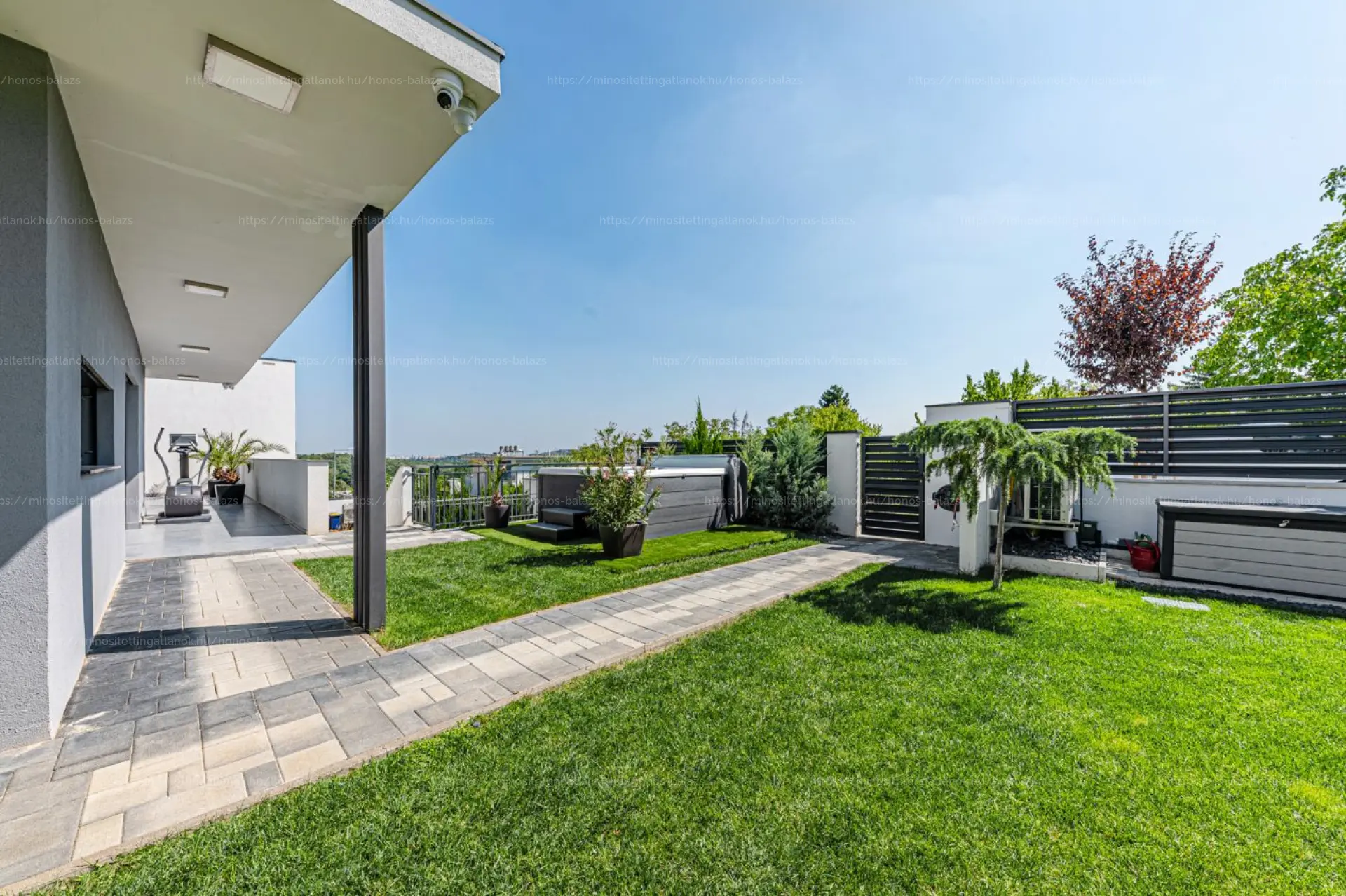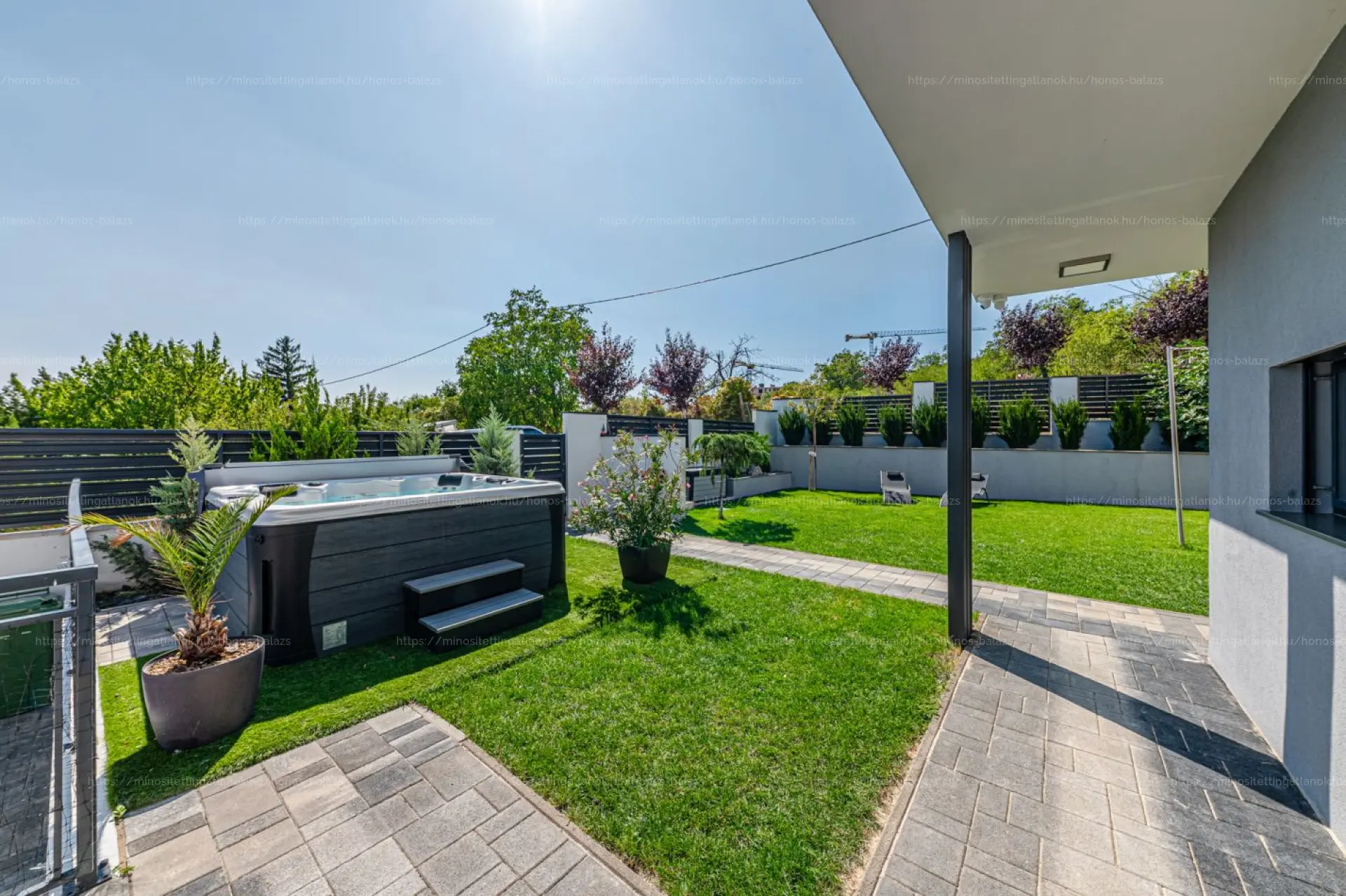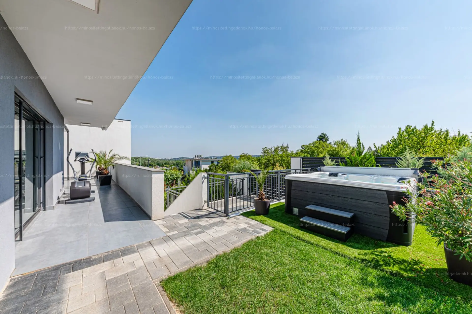 A gondozott, automata öntözőrendszerrel ellátott kizárólagos használatú, 210 nm-es kertben, amerikai gyártmányú, hat személyes CALL SPA (fokozott hőszigetelésű, energiatakarékos) jacuzzi kapott helyet, opcionálisan megvásárolhatóan, +5 M Ft értékben.