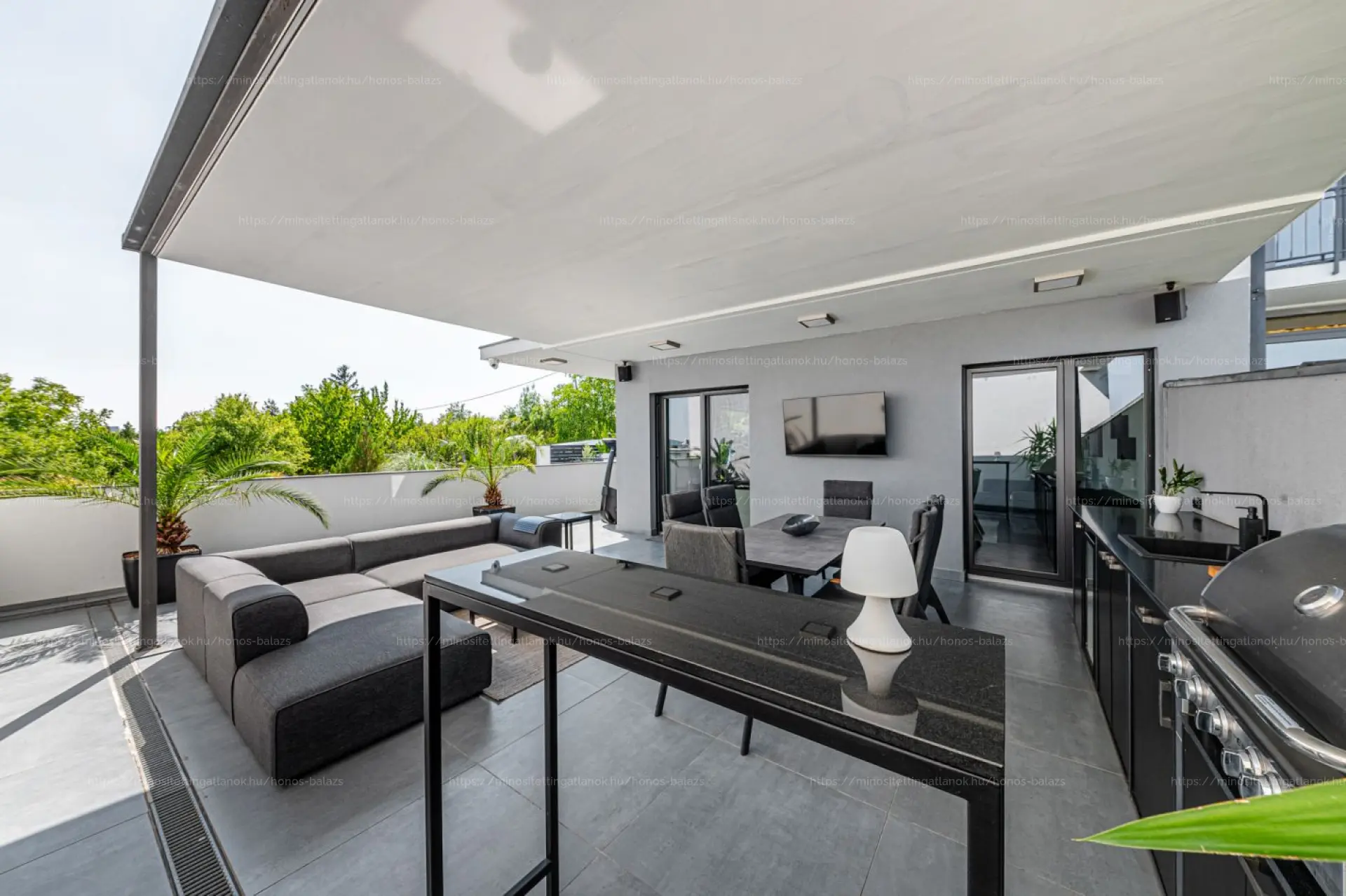 Az emeleti terasz a panoráma élvezhetősége érdekében üvegkorlátos, a földszinti, részben fedett, 52 négyzetméteres terasz pedig igazi szabadtéri élettér, tömör, 5 m hosszú, gránit munkapulttal, beépített vadonatúj SANTOS gázgrillel.