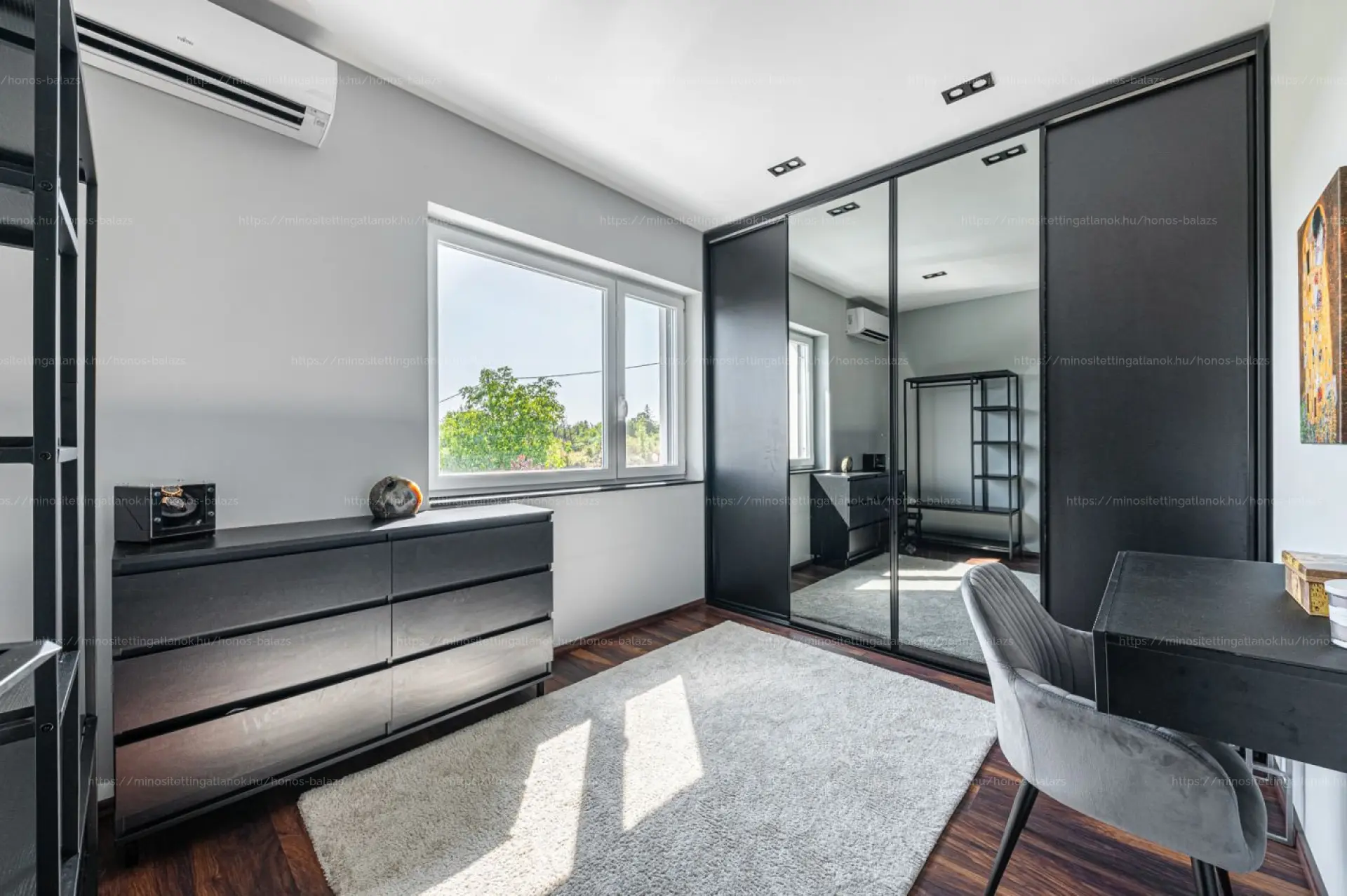 A 386 négyzetméteres, kizárólagos használatú telekhez tartozó, 155 négyzetméter számított alapterületű ingatlan, nappali plusz három hálószobás elrendezésű, két teljes értékű lakószinttel, valamint egy kiszolgáló szinttel.