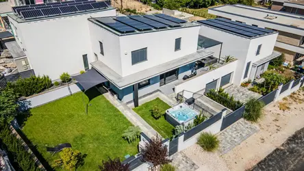 Az épület energetikai szempontból kiemelkedő: 15 cm vastag grafitos hőszigetelés, háromrétegű üvegezés, 11 kW-os napelemrendszer szaldós elszámolással és H tarifás villanyórával biztosítja a közel nulla rezsit.