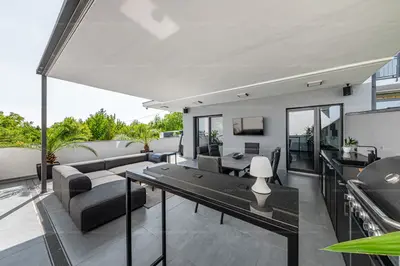 Az emeleti terasz a panoráma élvezhetősége érdekében üvegkorlátos, a földszinti, részben fedett, 52 négyzetméteres terasz pedig igazi szabadtéri élettér, tömör, 5 m hosszú, gránit munkapulttal, beépített vadonatúj SANTOS gázgrillel.