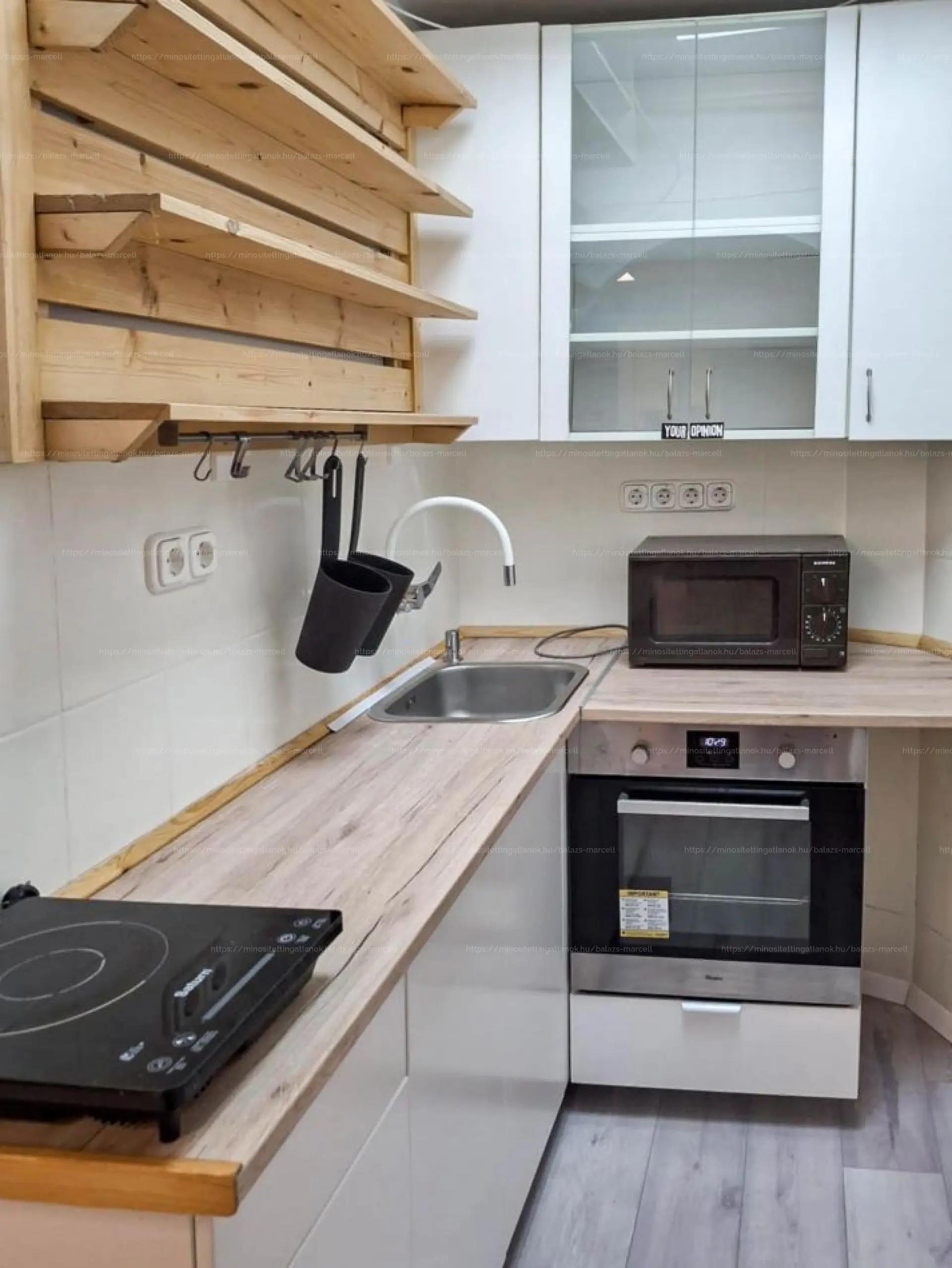 Gépesített, modern konyha (mosógép, sütő, kerámialap + indukciós főzőlap, hűtő)