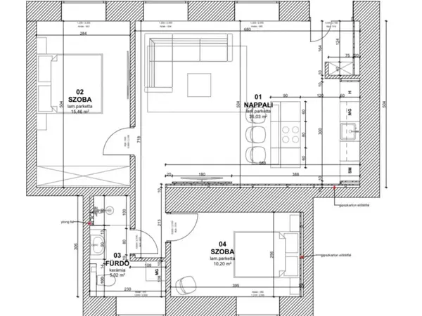 64 nm alapterületű, melyben 1 nappali és 2 hálószoba kapott helyet.