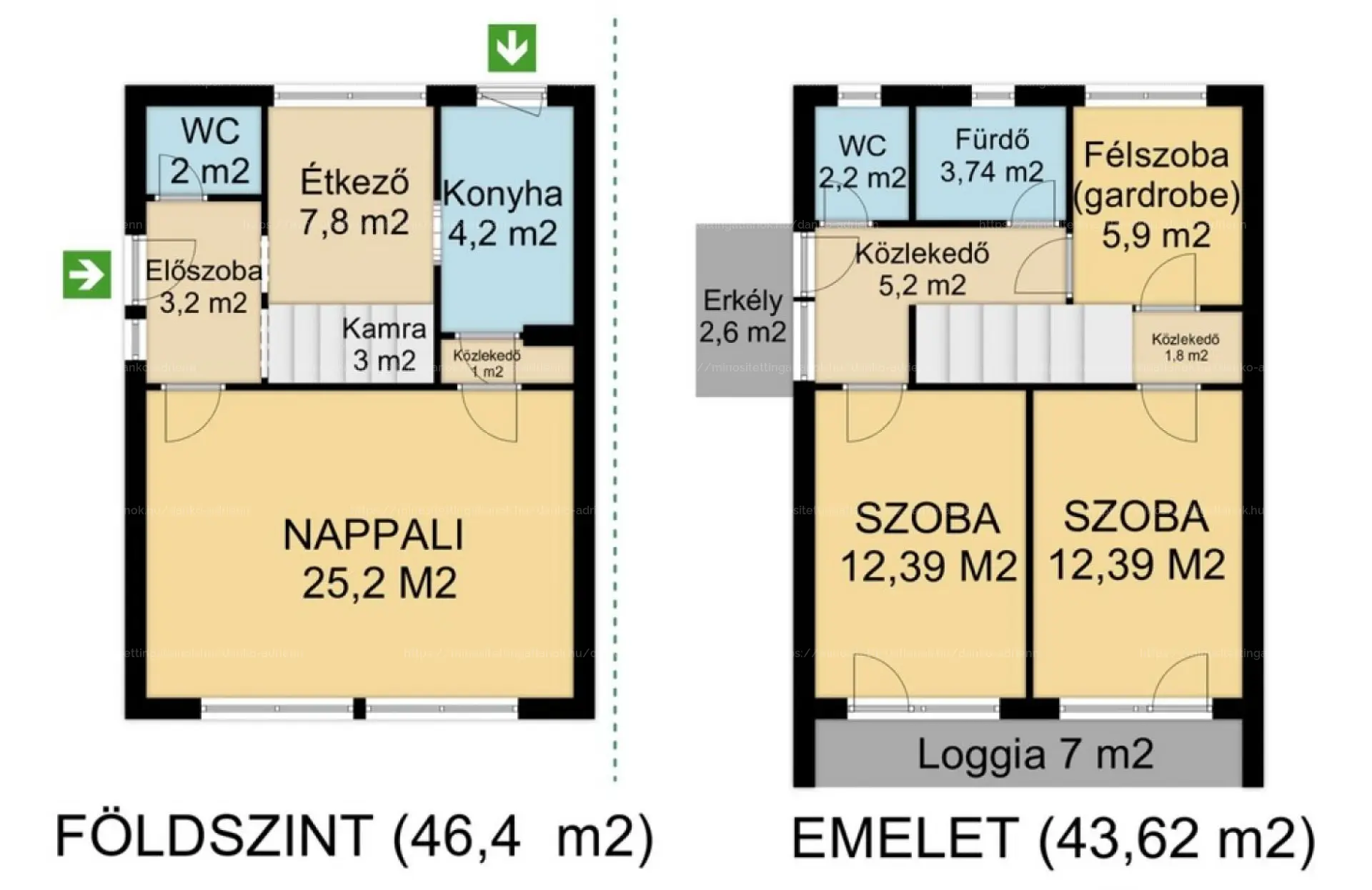 - Emelet (44 m2, ferde falak nélkül): két utcai SZOBA közvetlen LOGGIA-kapcsolattal, FÉLSZOBA/GARDRÓB, FÜRDŐSZOBA káddal, külön WC kézmosóval. Plusz ERKÉLY és BŐVÍTHETŐ TETŐTÉR.