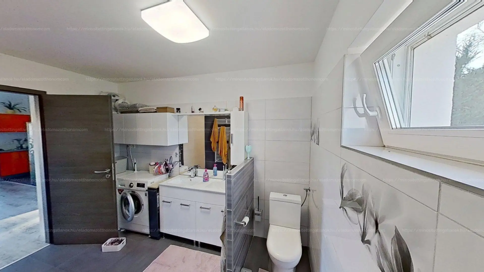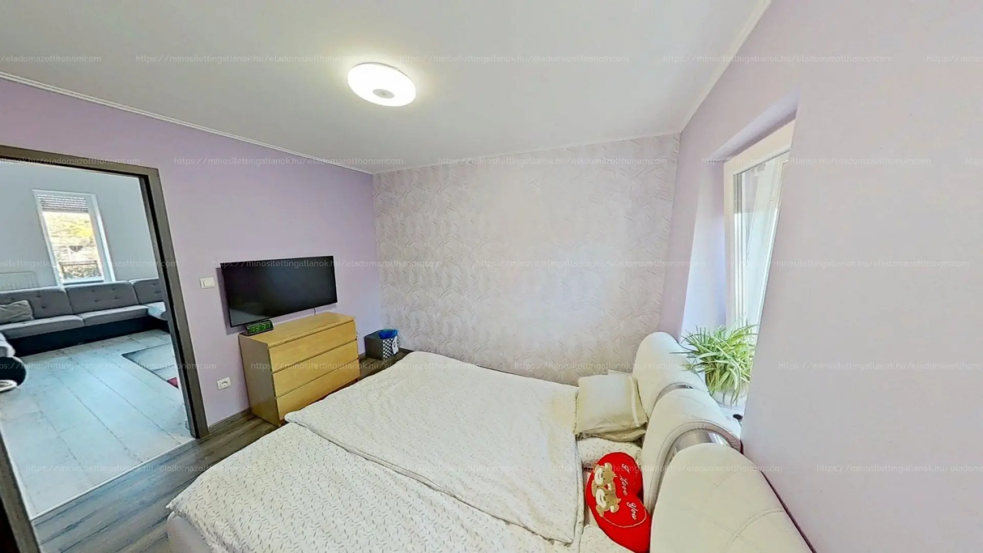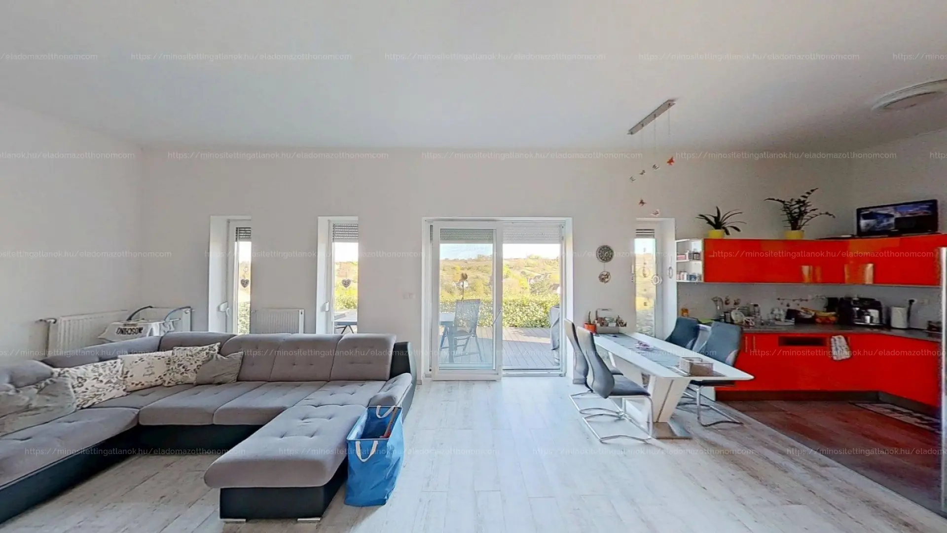 A ház elosztása nem is lehetne jobb, az egy szinten minden a hatalmas nappaliból nyílik. Innen nyílik 3 hálószoba - a szülői háló ráadásul nagy gardrób szobával is rendelkezik - fürdő, valamint innen lehet kimenni a páratlan panorámával bíró, 20 nm-es teraszra is.